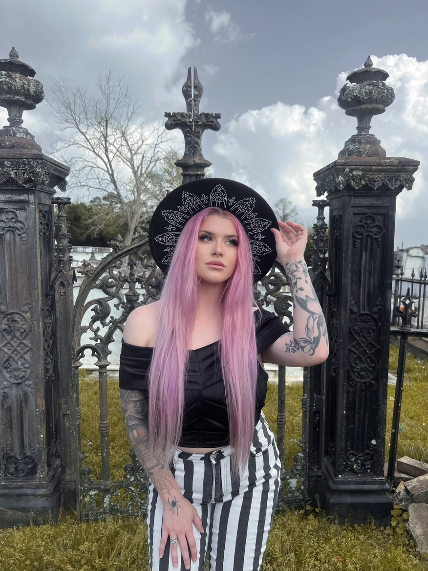 Crown yourself in shadows with the Wrought Iron Crown XL Brim Hat — a spellbinding collab between WITCHWOOD x WITCHVOID. Inspired by the intricate beauty of gothic wrought iron architecture in New Orleans, this design wraps your crown in delicate, haunting detail that feels equal parts regal and rebellious. It’s the kind of piece that turns a sidewalk into a runway and a glance into a double-take.