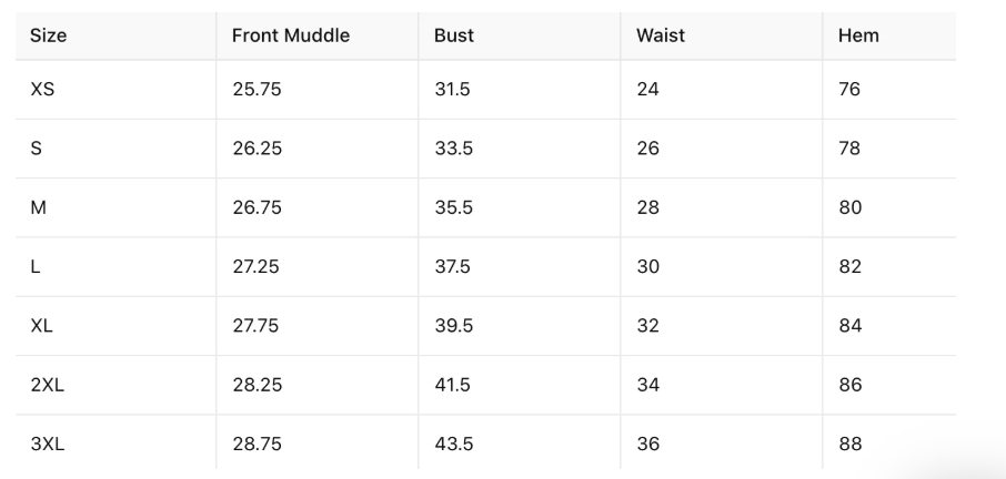 Size Chart listed in photos. If you're unsure of sizing, please feel free to send us your measurements in the "ask a question" section below and we can suggest the best size for you.