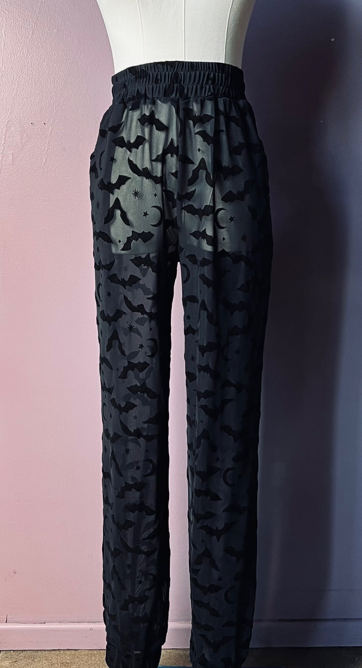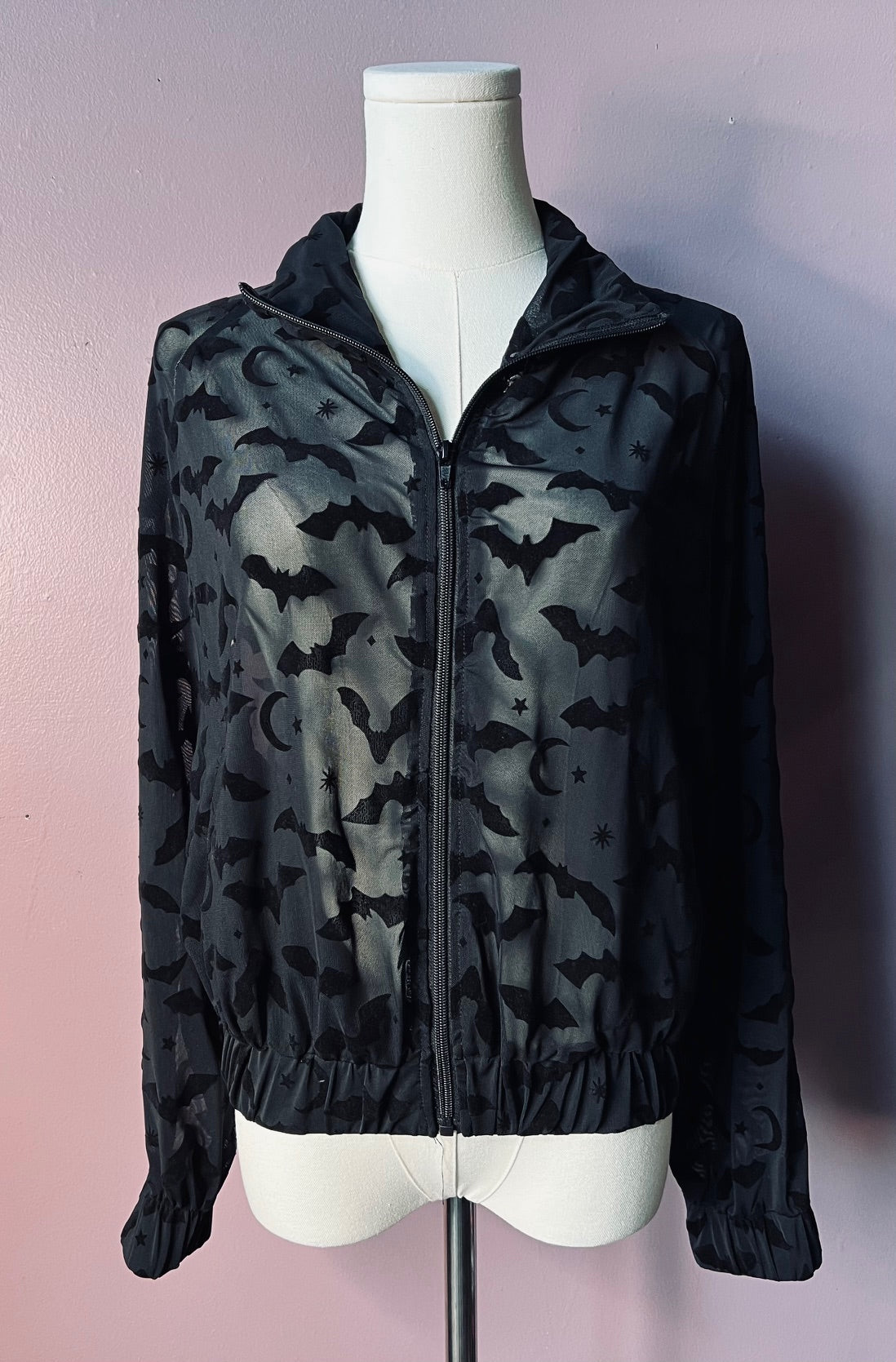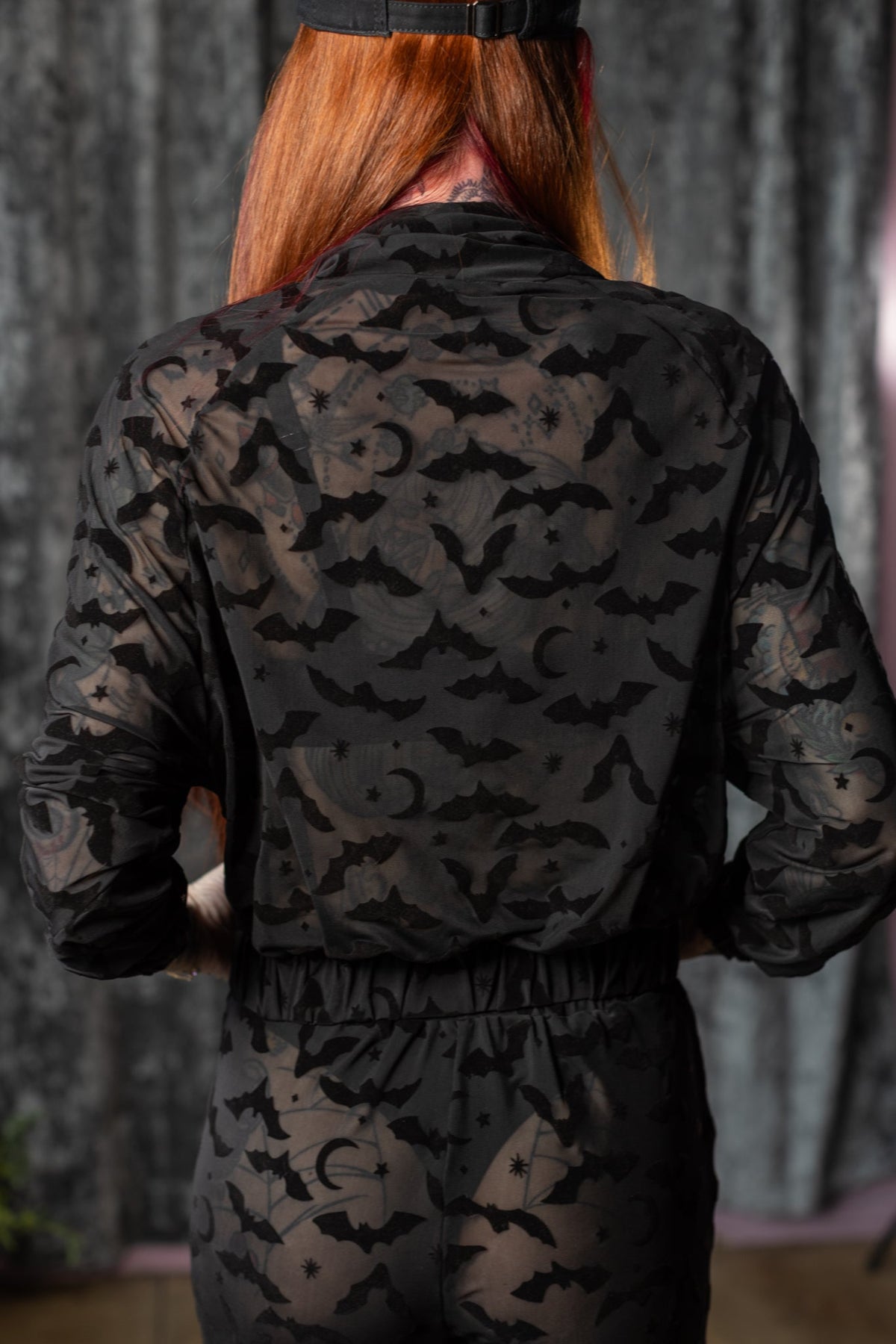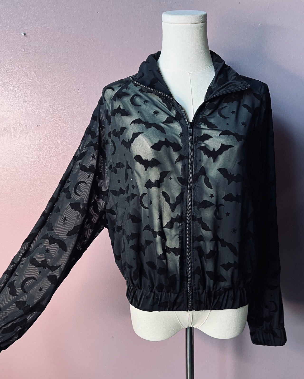 These track jackets and joggers are super stretchy and comfy! Sheer velvet flocked bat fabric!