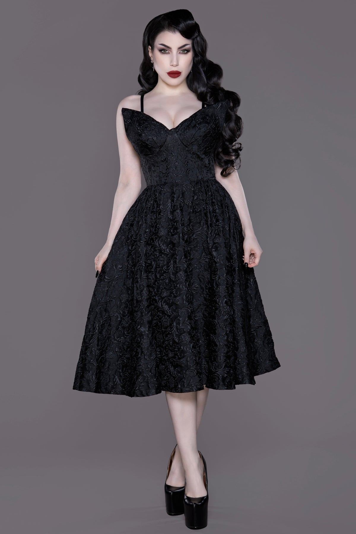 Allow your unique style to soar in the Dragon Damask Swing Dress. Made from medium-weight, textural brocade polyester, this dress features an intricate, black-on-black damask design that exudes sophistication. The poly-satin lining ensures comfort, while an invisible zipper and adjustable straps create a sleek silhouette.