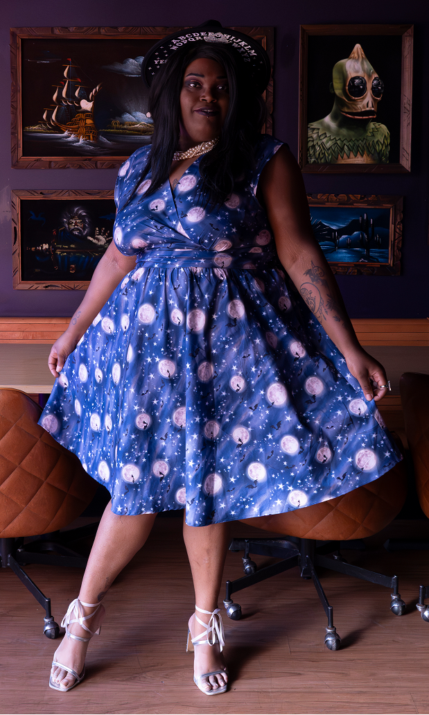 The Bat Moon Greta Dress is everything you could want in a dress and more, showcasing a gorgeously spooky print of bats soaring against the moon in a star-filled sky. Made from soft cotton, this vintage-inspired design features a gathered surplice neckline, a flattering cummerbund waist with gentle gathers, and a twirl-worthy skirt that falls to the knee. Complete with hidden side pockets and a back zippered closure, it’s the perfect dress for spooky season and beyond.