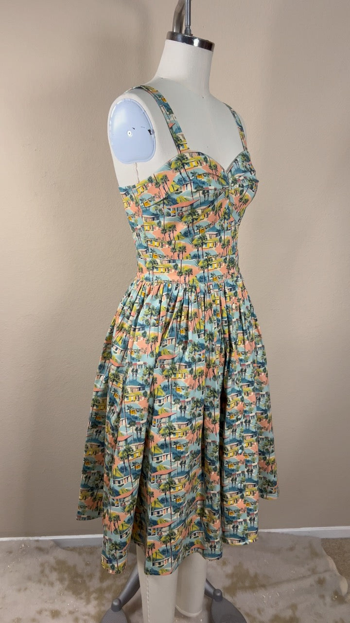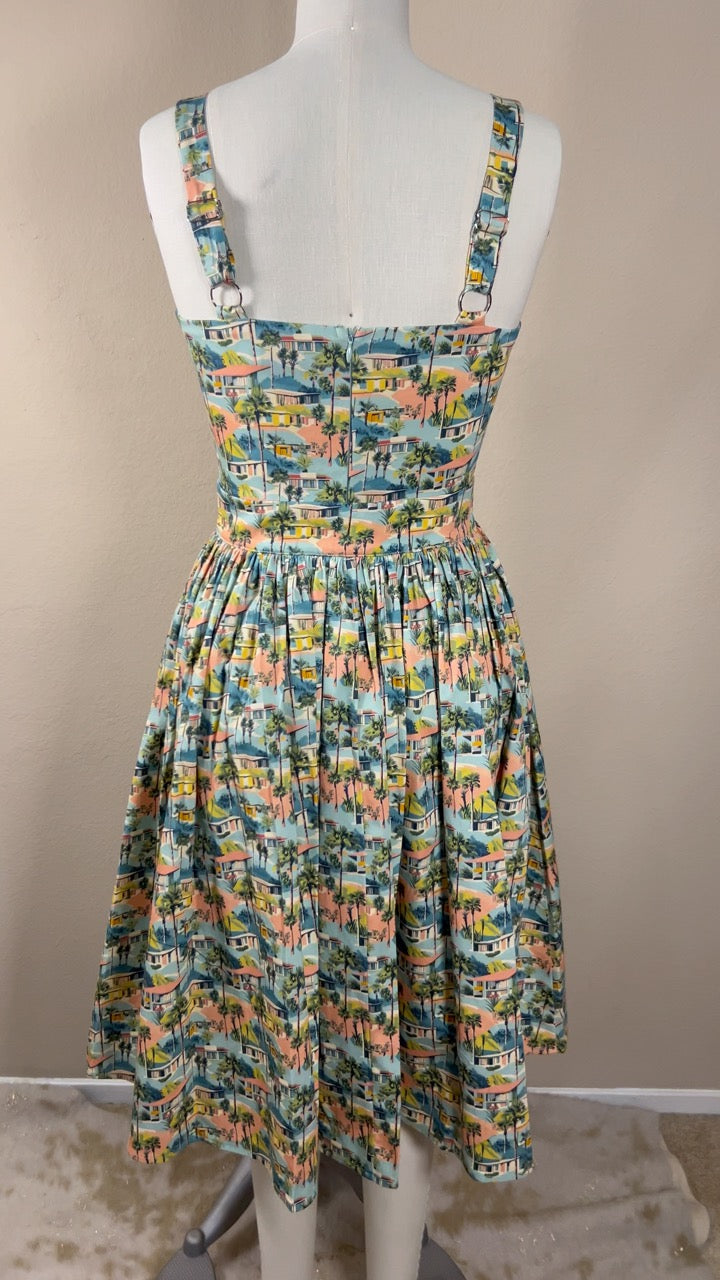 Step into a sun-soaked daydream with this vintage-inspired Palm Spring Romper Set! Featuring a sweetheart neckline and adjustable straps for a perfectly pin-up fit, this playful piece hugs your curves with its fitted bodice before flaring out into your choice of sassy shorts or a breezy skirt. The pastel-toned print, dotted with charming mid-century houses and swaying palm trees, feels like a postcard from a retro California getaway🌴