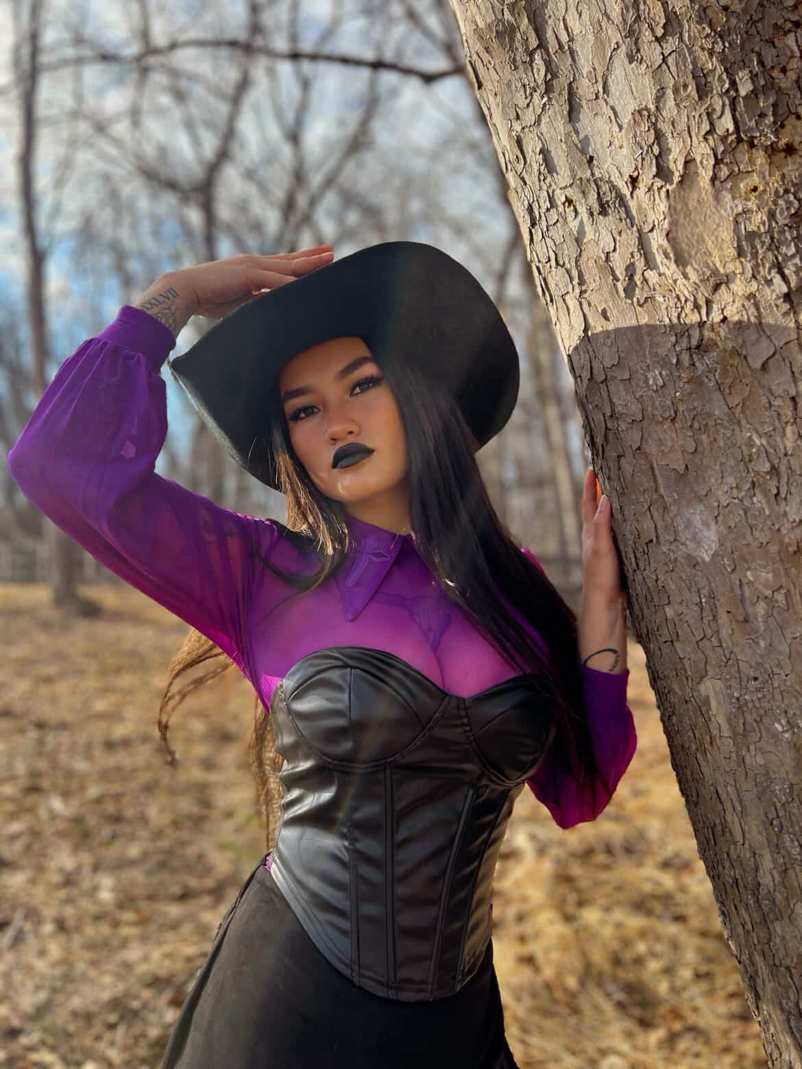 Reach out and touch faith in this long-sleeve, soft mesh top with bold embroidered cross patches on an extended pointy collar that is sure to turn heads. See-through mesh is stretchy for all your dancing needs. A keyhole cut-out shows off a bit of back, but how daring you make this piece is up to you.