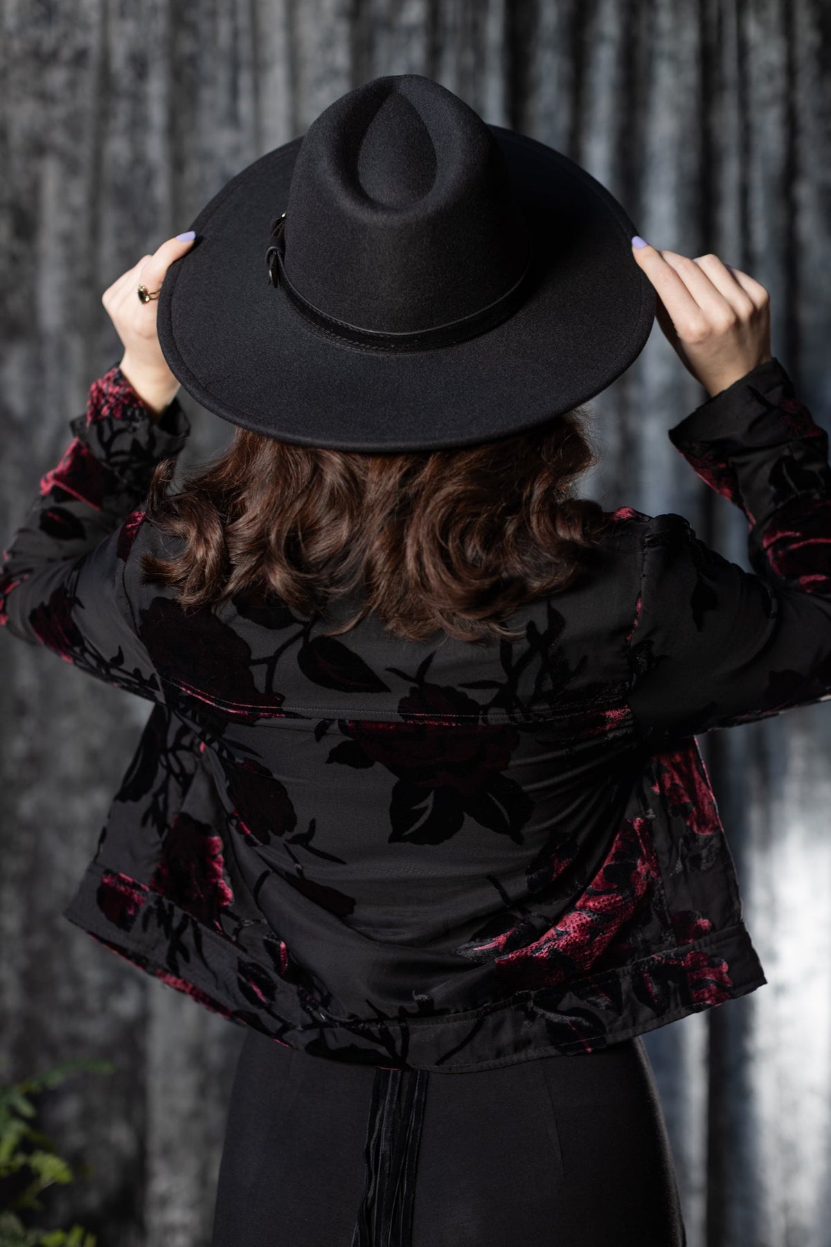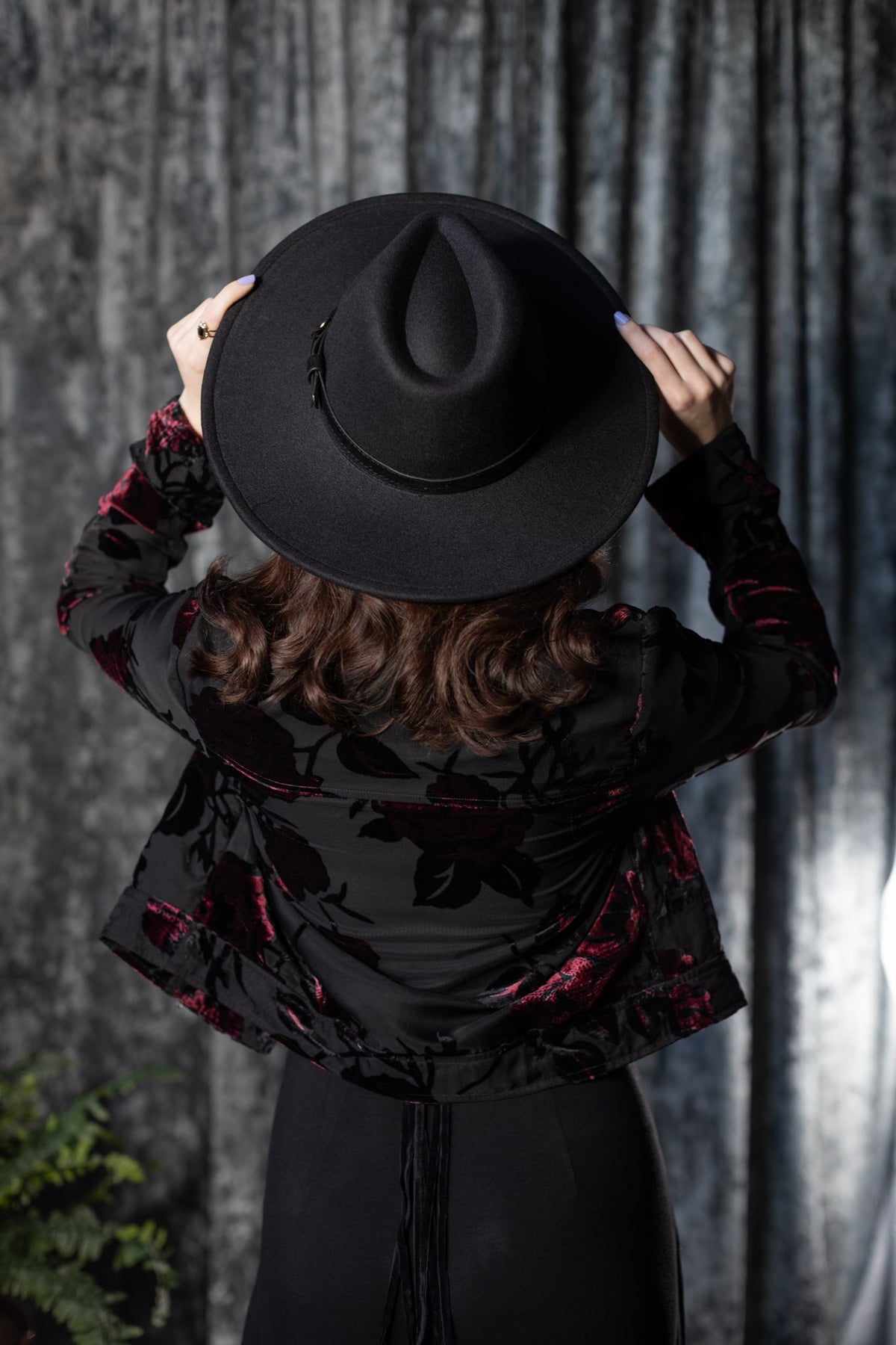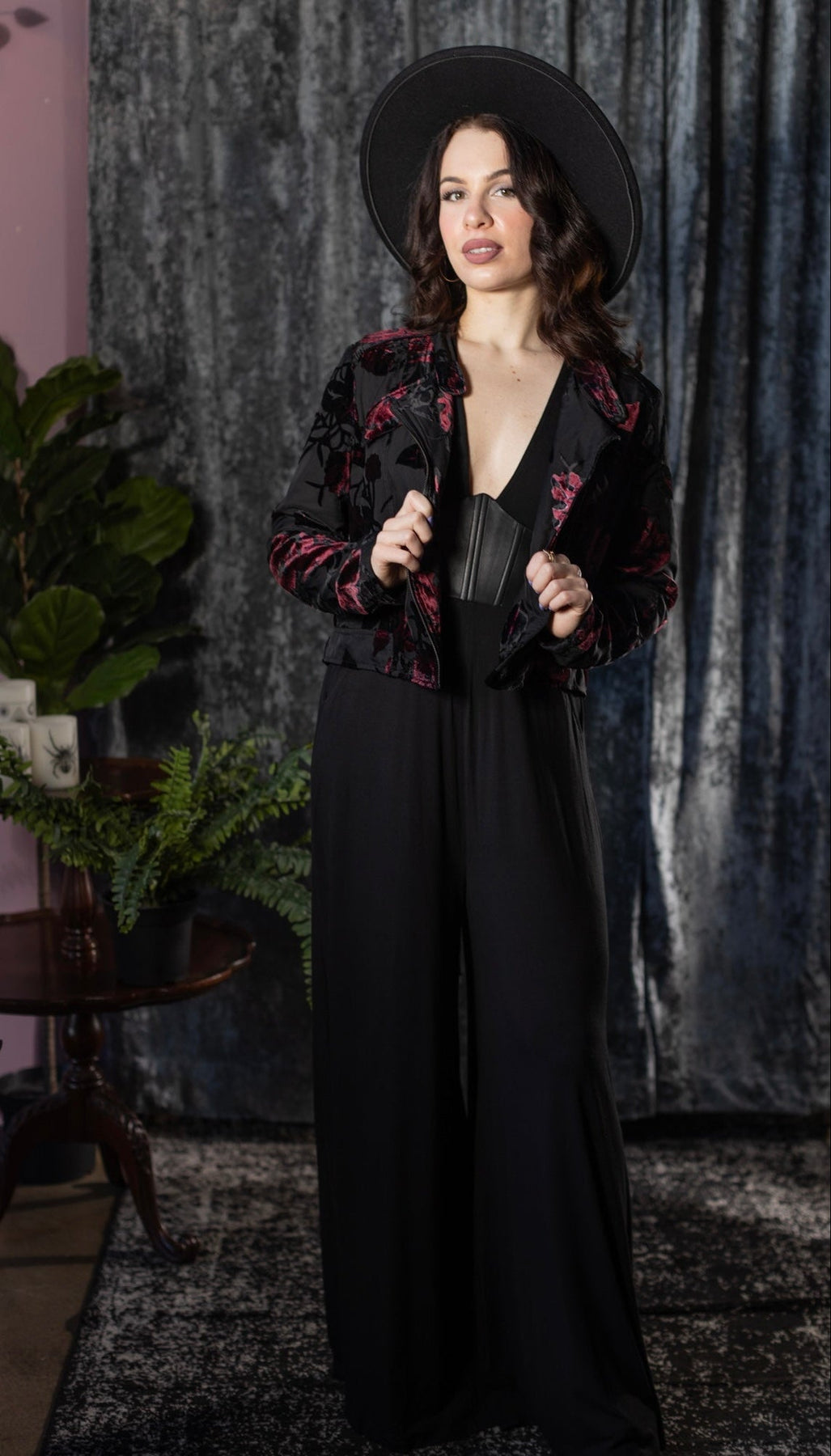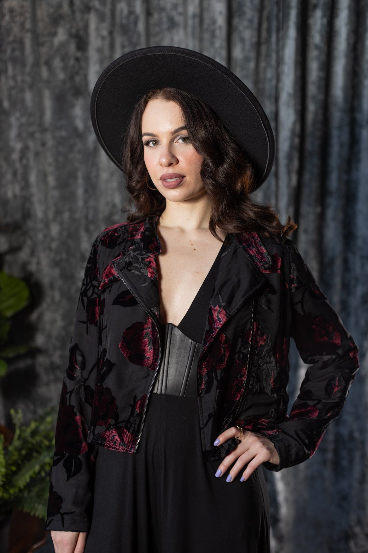 The Rowena jacket is designed to cast a quiet spell. Cut in a cropped moto silhouette, this piece brings structure and edge while remaining light enough for effortless layering. Crafted from custom velvet flocked crimson floral mesh, it balances transparency and texture. The soft velvet print blooming against sheer darkness.