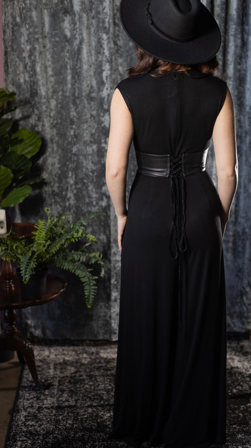 An attached vegan leather, corset style lace-up waist defines the form while allowing adjustable comfort. This jumpsuit is the epitome of classic structure without sacrificing wearability. Finished with a comfortable wide leg, the Blair Jumpsuit balances gothic style with everyday ease.