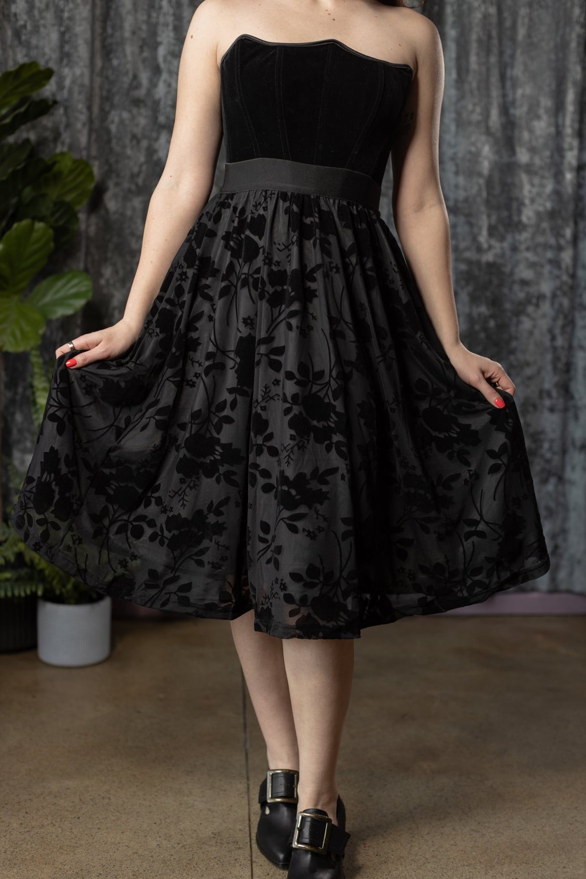 It features a super stretchy and curve hugging elastic waistband, stretchy sheer velvet flocked mesh skirt and with charcoal lining.