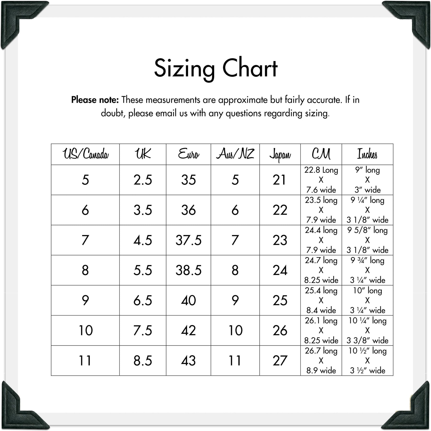 ~If your feet are very narrow in width, please size down. If your feet are narrow-to-average in width, order your usual size. If your feet are average-to-wide in width, please size up.