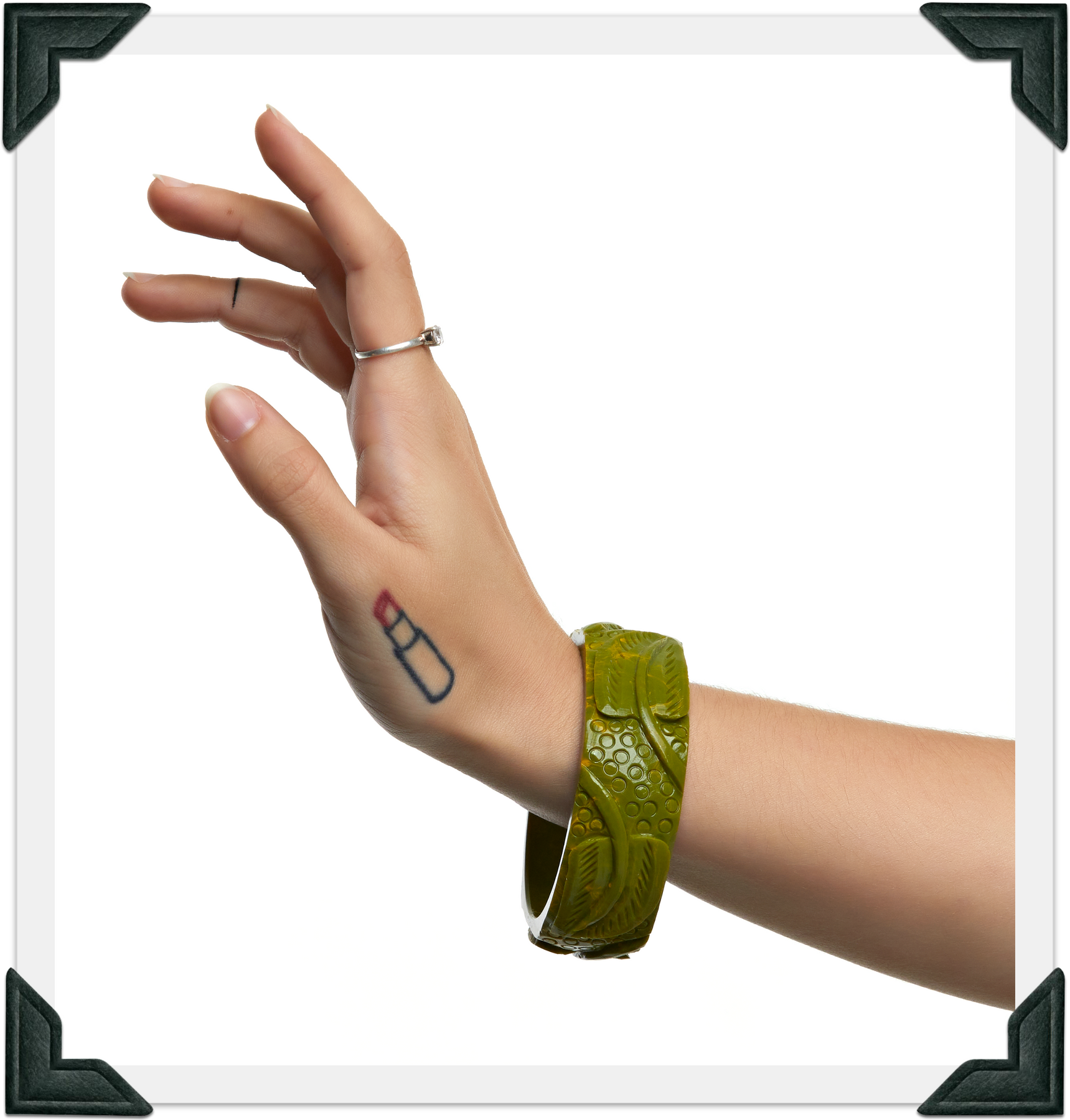 This new Collection features bracelets that are very weighty and highly-carved. They're just like your favorite Bakelite bracelets but Tiki!